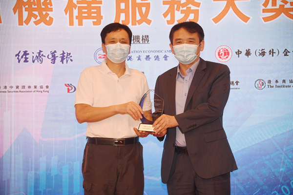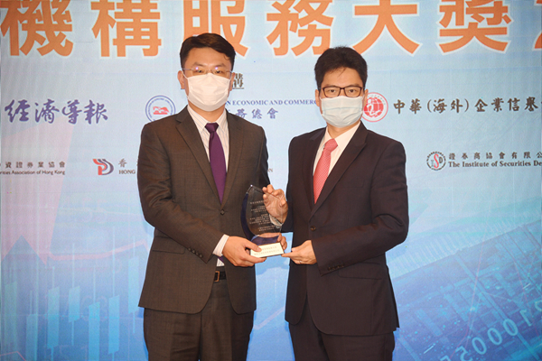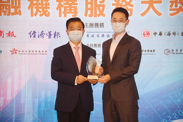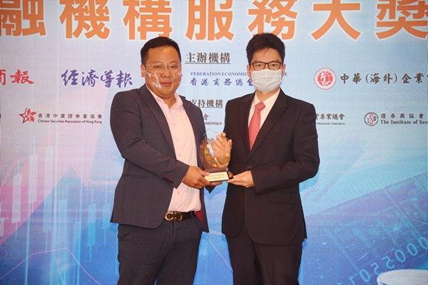 香港中資證券業協會永遠名譽會長、香港中華總商會副會長謝湧海(左)頒獎予富昌證券客戶投資服務部副總裁姚正。