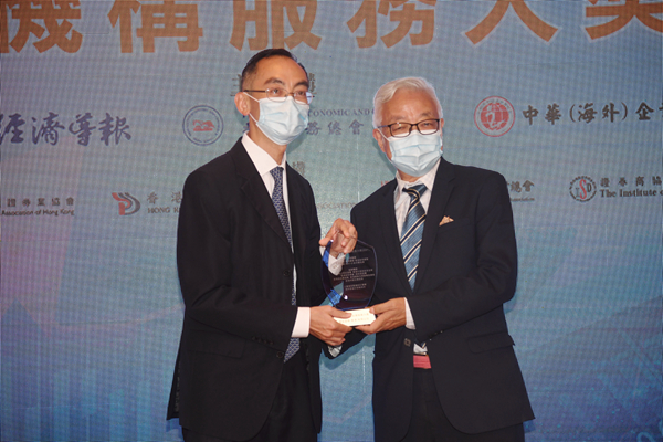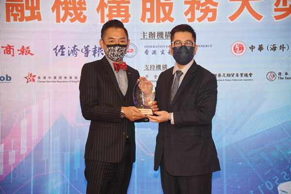 香港中小企協會名譽會長、證券商協會永遠名譽會長及副主席蔡思聰(右)頒獎予DFG尊尚理財副總裁吳國偉。