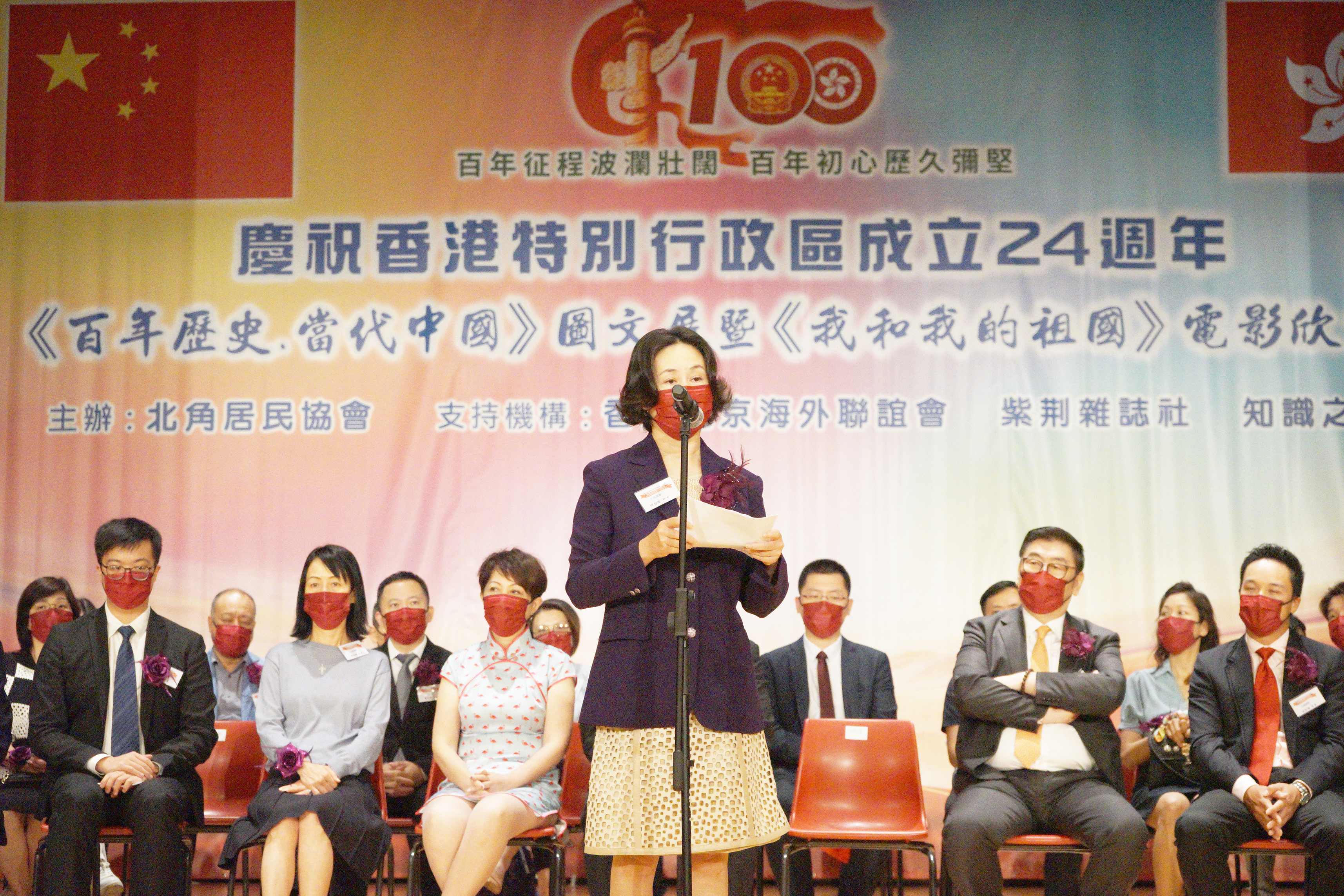 何超瓊致辭說,7月1日除了回歸周年外,還有一件大事。那就是中國共產黨成立的百年華誕,出席活動她感到非常榮幸。她說,一百年前的中國山河破碎,飽受欺凌,在那樣一個困難時期中國共產黨誕生了,這是開天闢地的大事。中國共產黨百年來為了人民流血犧牲,而香港回歸則是為這個壯麗史詩增添了華彩篇章。