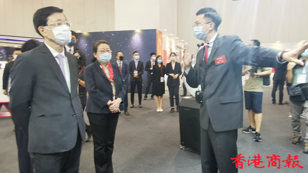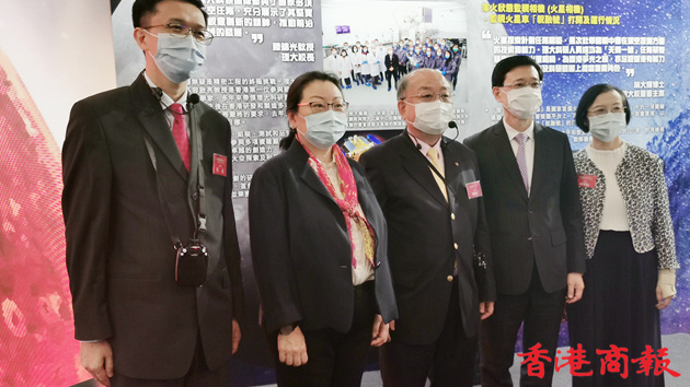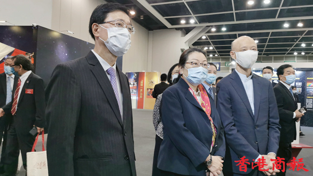「時代精神耀香江」之百年中國科學家主題展暨月壤入港揭幕儀式,今日(26日)在灣仔會展舉行。行政長官林鄭月娥、新任政務司司長李家超、新任保安局局長鄧炳強等人出席展覽揭幕儀式。儀式結束後,林鄭等人一起參觀香港理工大學參与的國家航天工程項目,容啟亮教授在旁講解。李家超、鄧炳強及律政司司長鄭若驊等人也參觀了相關展品。今次亦是李家超、鄧炳強上任後,首次出席公開活動。(记者木子摄)