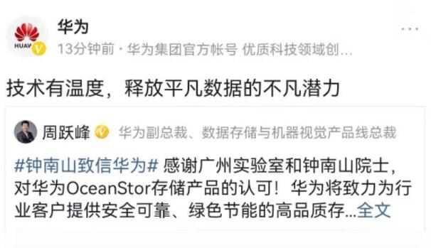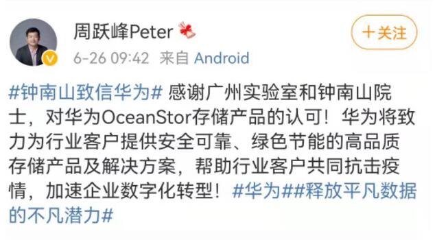周躍峰在微博中表示:「感謝廣州實驗室和鍾南山院士,對華為OceanStor存儲產品的認可!華為將致力為行業客戶提供安全可靠、綠色節能的高品質存儲產品及解決方案,幫助行業客戶共同抗擊疫情,加速企業數碼化轉型!」。