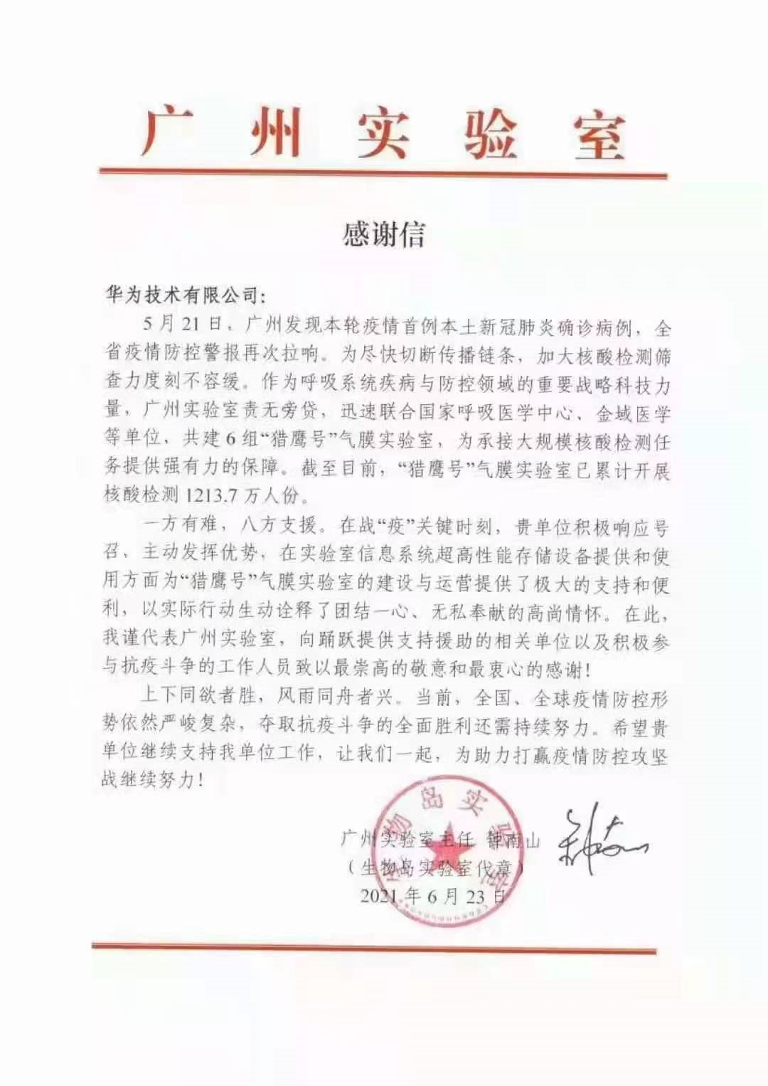 信中說:自5月21日,廣州發現本輪疫情首例新冠肺炎確診病例後,為盡快切斷傳播鏈條,加大核酸檢測篩查力度,迅速組建了6組「獵鷹號」氣膜實驗室,為承接大規模核酸檢測任務提供有力保障。在此過程中,華為公司積極響應號召,主動發揮優勢,為實驗室信息系統超高性能存儲設備提供和使用方面為「獵鷹號」氣膜實驗室的建設與運營提供了極大的支持和便利。