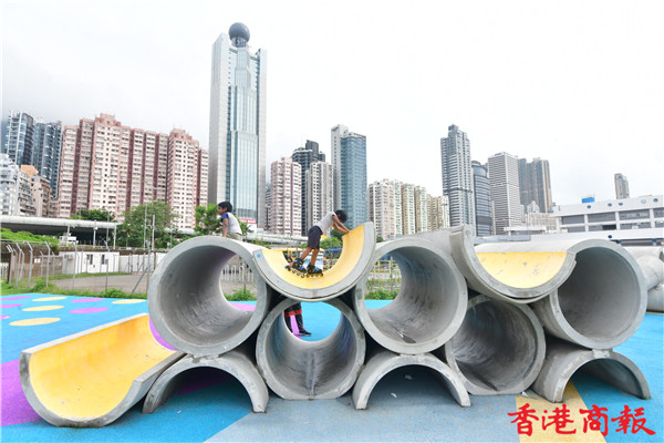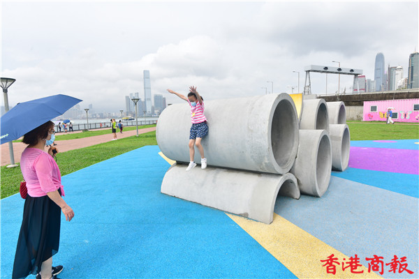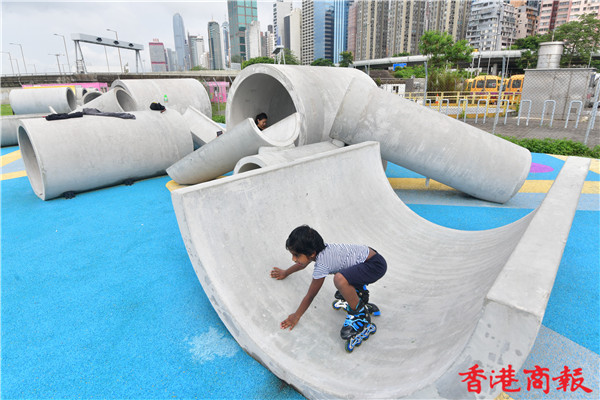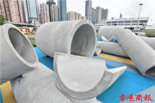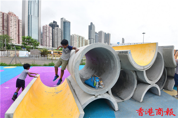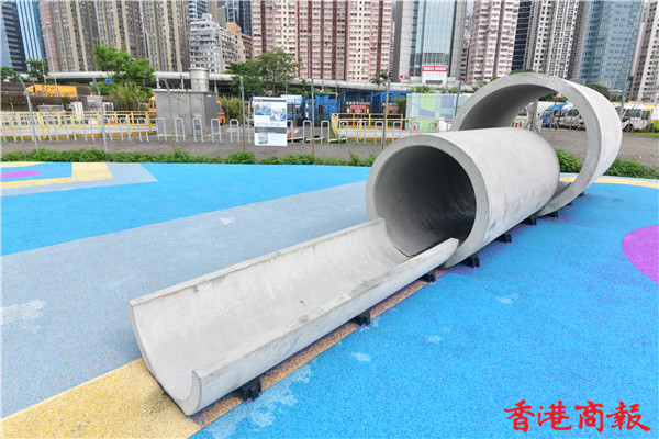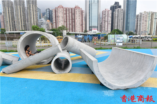 場內多個渠管組成的遊樂場設施,不論多種擺放角度及渠管重重疊起,充滿工業風外,這組設計更是出自本地學生與設計師的創意靈感,讓人緬懷七十年代早已在葵涌石籬邨渠管遊樂場可見的設施而建成。