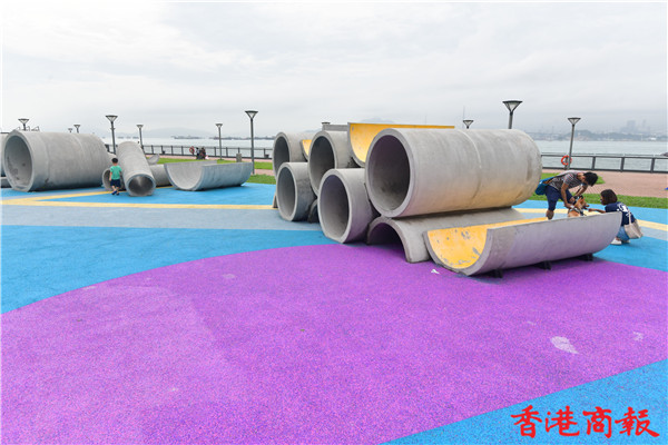 在渠管陣附近,設有多個色彩繽紛的貨櫃為公園點綴,帶來更多活力開心。這個「捐山窿公園」以愈簡單、愈好玩的原則,讓小童可爬上爬落、瀡滑梯、玩捉迷藏等,甚至在水管內獨自一人沉思,也是賞心樂事。(崔俊良 攝)