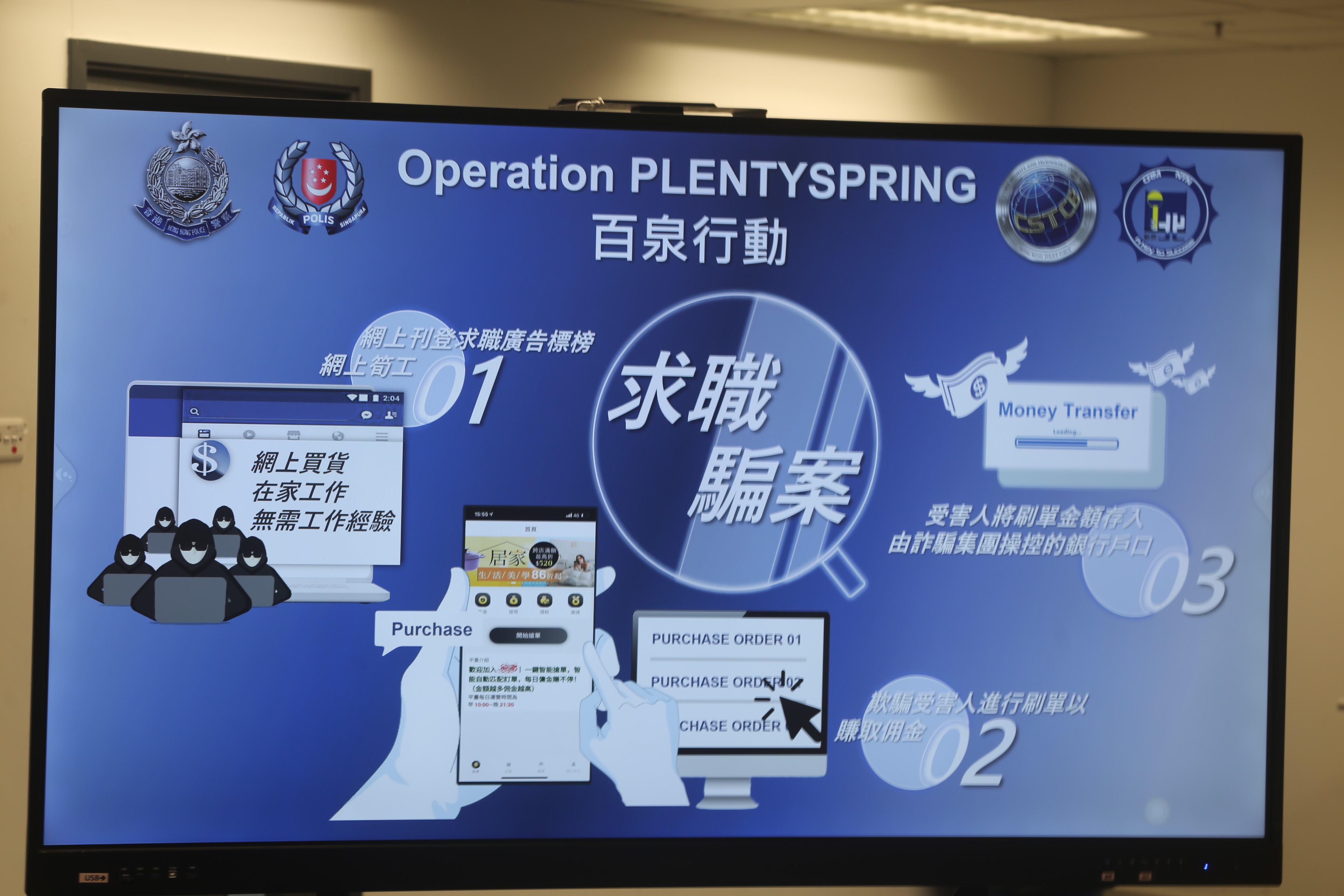 警方搗破一個跨境網上求職詐騙集團,在本港和新加坡兩地以「搵快錢」作招徠,吸引求職人士在網上購物平台「刷單」,共涉及430宗騙案,涉及金額3000萬元,兩地警方攜手在本月中展開代號「百泉」行動 ,共拘捕 41人,包括兩名集團主腦。