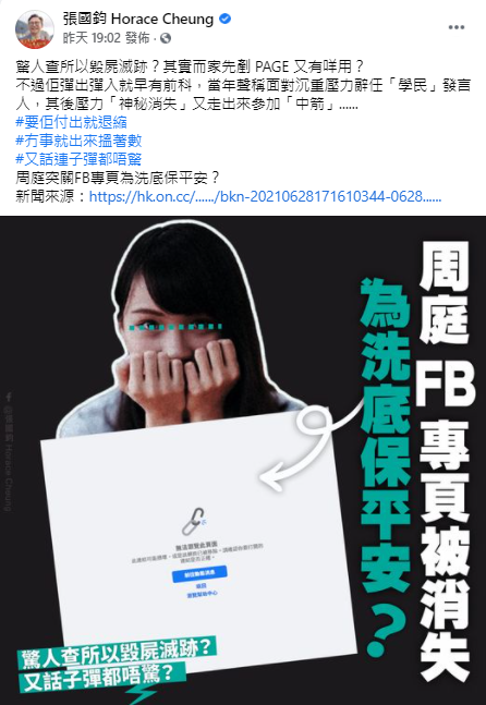 周庭在facebook上經常發表政治言論,未知專頁關閉是否與她涉嫌違反國安法案件有關。