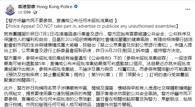 就有團體擬於明日(7月1日)在港島區進行集會及遊行,警方認為有需要維護公共安全、公共秩序及保護他人的權利和自由,且基於新冠肺炎疫情對社會構成嚴重的健康風險,有理由相信舉行集會及遊行會對市民的生命與健康構成重大威脅,故發出「禁止公眾集會及反對公眾遊行通知」。申請人提出上訴,公眾集會及遊行上訴委員會經聆訊後,昨日(29日)駁回上訴申請,維持警方決定。
