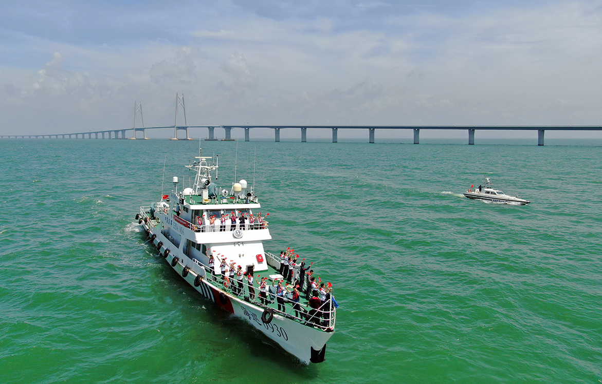 7月1日上午,港珠澳大橋水域晴空萬里,碧波蕩漾。珠澳口岸人工島碼頭,執法人員整齊列隊,「海巡0930」「海巡09076」「珠海水警108」和「中國漁政44189」四艘執法船艇整裝待發。7時45分,全體執法人員登上「海巡0930」,觀看「中國共產黨成立100周年慶祝大會」現場直播。