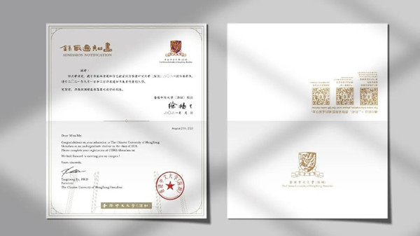 香港中文大學(深圳)2021年本科生錄取通知書主題為「窗之所在,光之來處」,其中 「窗」的靈感,來自於校園裏處處可見的特色窗欞,溫暖、勤奮、燈火通明的窗,匯聚成校園裏最動人的風景線,也是勤奮學子最好的青春見證和全體師生最難忘的歲月。打開窗,遇見了光,既照亮了學生的夢想,也引領學生們看到美好的未來、走向更廣闊的世界。