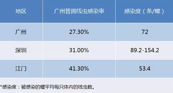 在廣州褐雲瑪瑙螺的廣州管圓線蟲感染率為27.3%,感染度為72條/螺;