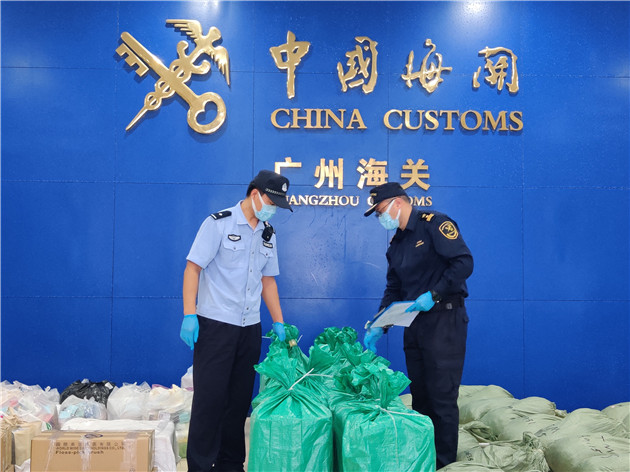 海關關員和海關緝私警察對查獲的走私貨物進行清點