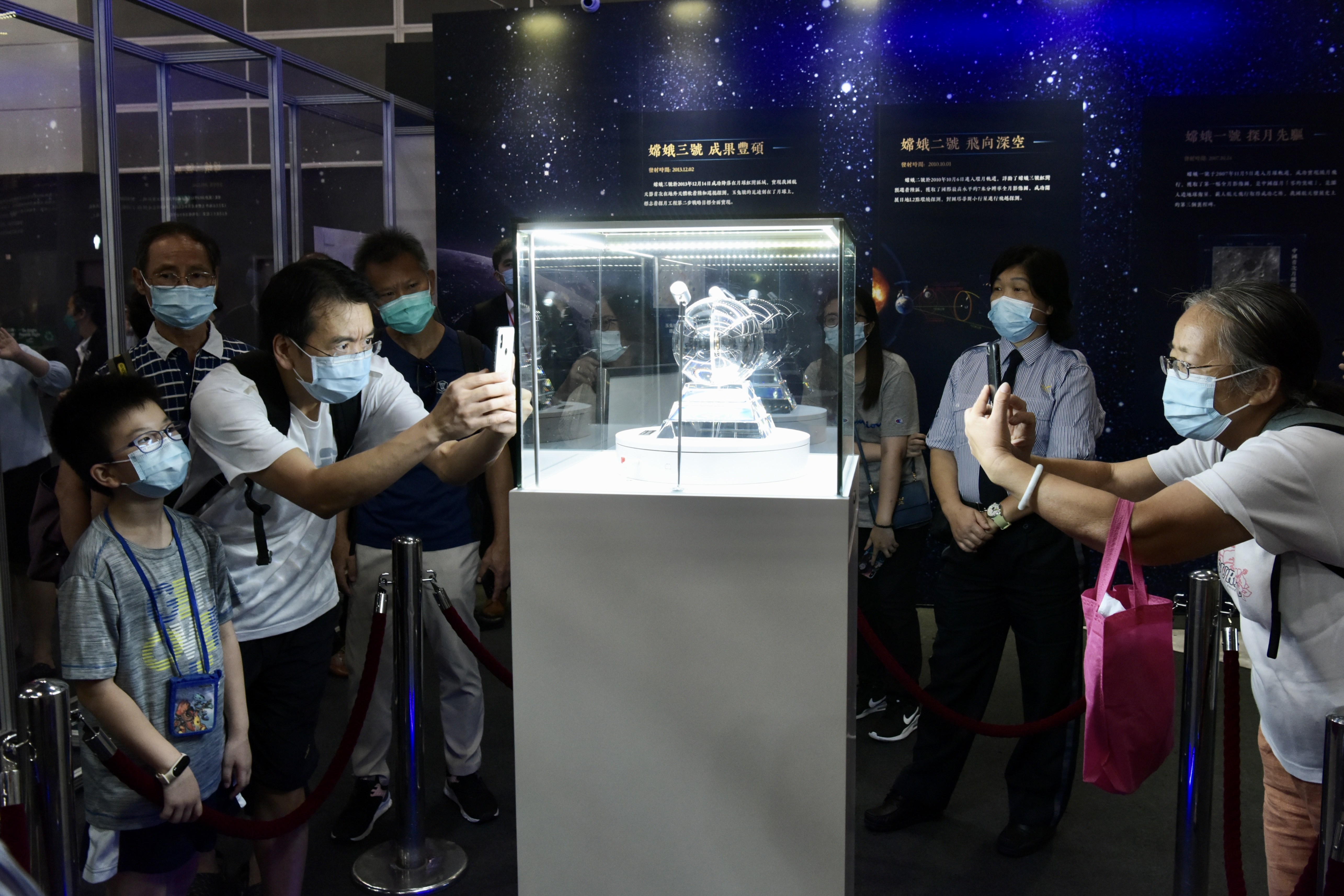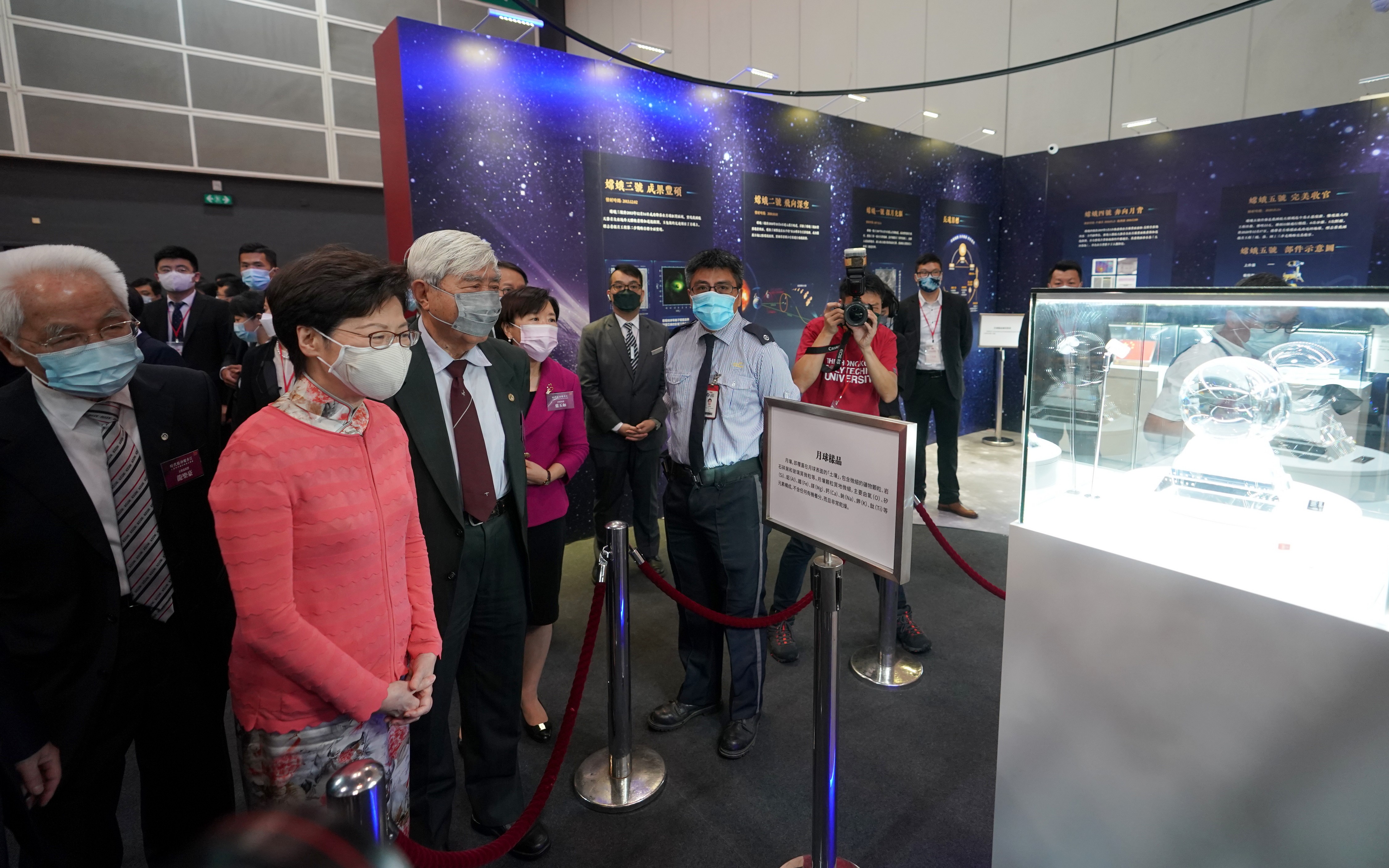 6月26日上午,「時代精神耀香江」之百年中國科學家主題展暨月壤入港揭幕儀式在香港會展中心舉行,由嫦娥五號探測器採集的月球樣品(月壤)首次在香港展出。圖為香港特區行政長官林鄭月娥(前排左一)在神舟飛船首任總設計师戚發軔(左二)等陪同下參觀月壤。中新社