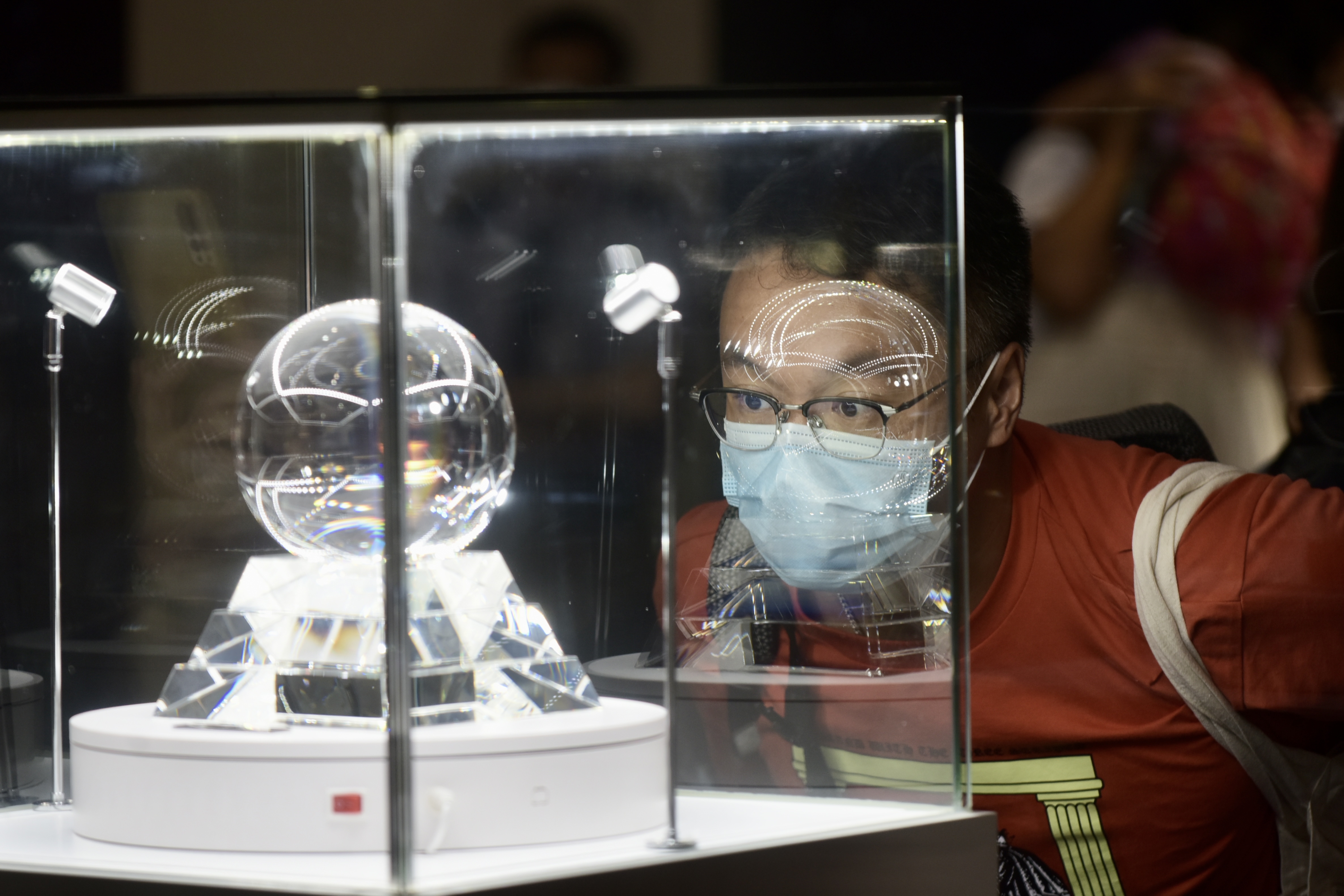 市民近距離觀看月球土壤。中新社。