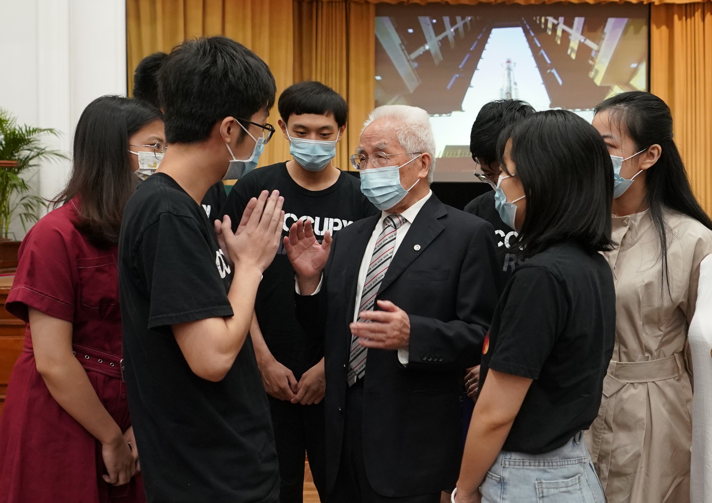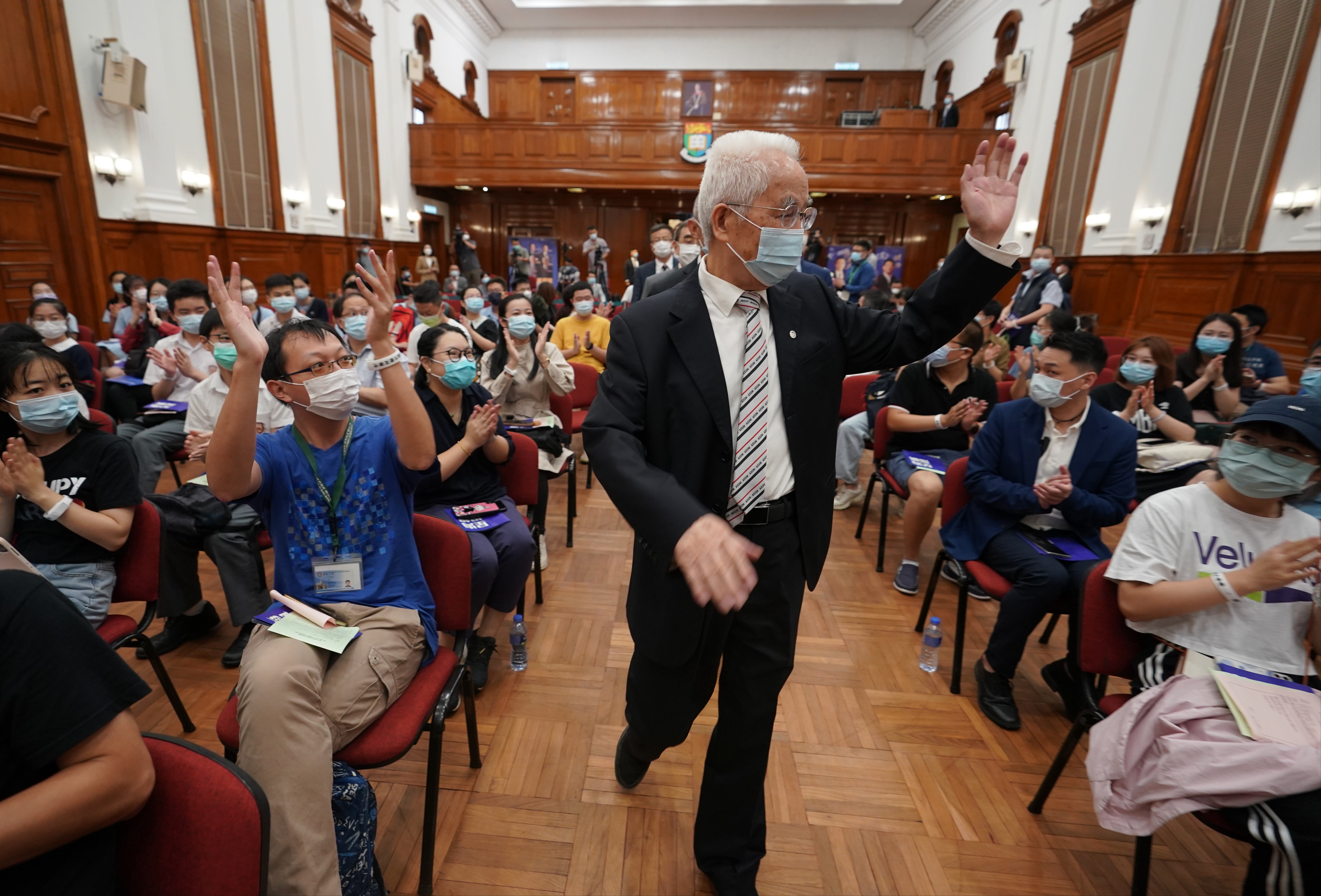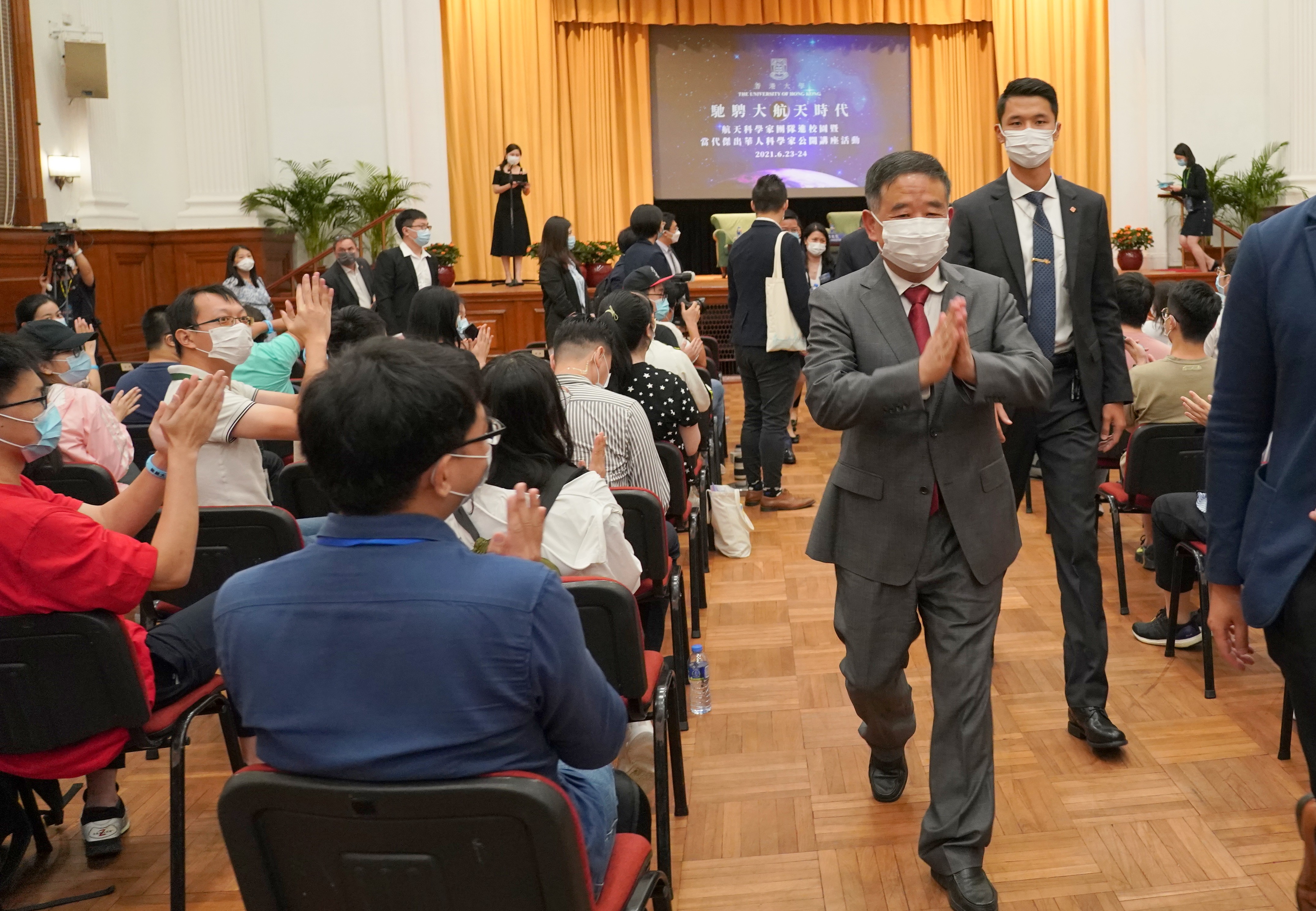 6月24日,中國工程院院士、長征系列火箭總設計师龍樂豪在香港大學發表題為《長征火箭與中國航天》的演講。圖為當龍樂豪步入港大陸佑堂時,現場师生鼓掌歡迎。中新社