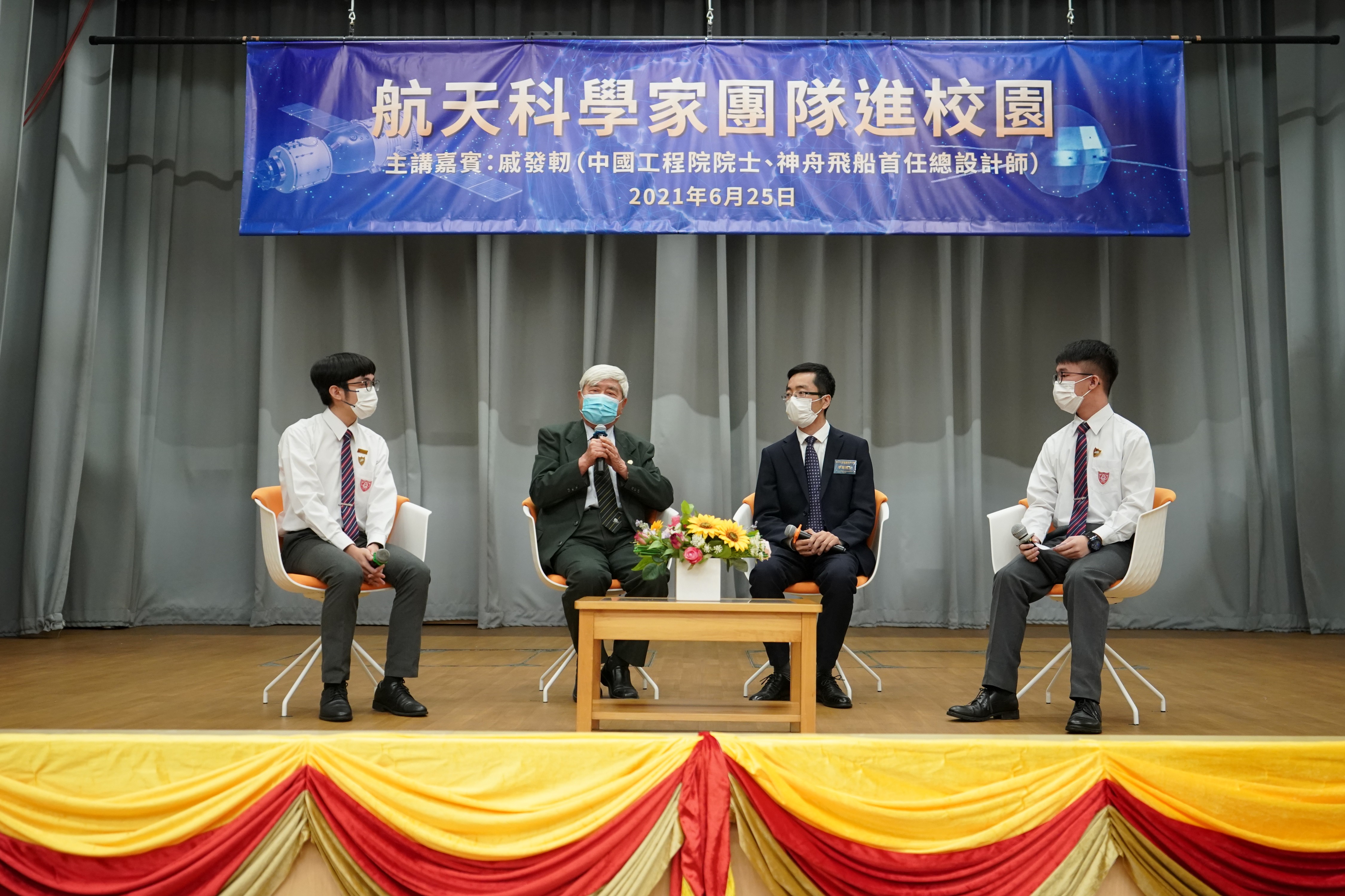 6月25日上午,中國工程院院士、神舟飛船首任總設計师戚發軔走進香港百年名校皇仁書院,向香港中學生代表暢談中國航天與航天精神。圖為戚發軔(左二)與台上台下的中學生互動交流。中新社