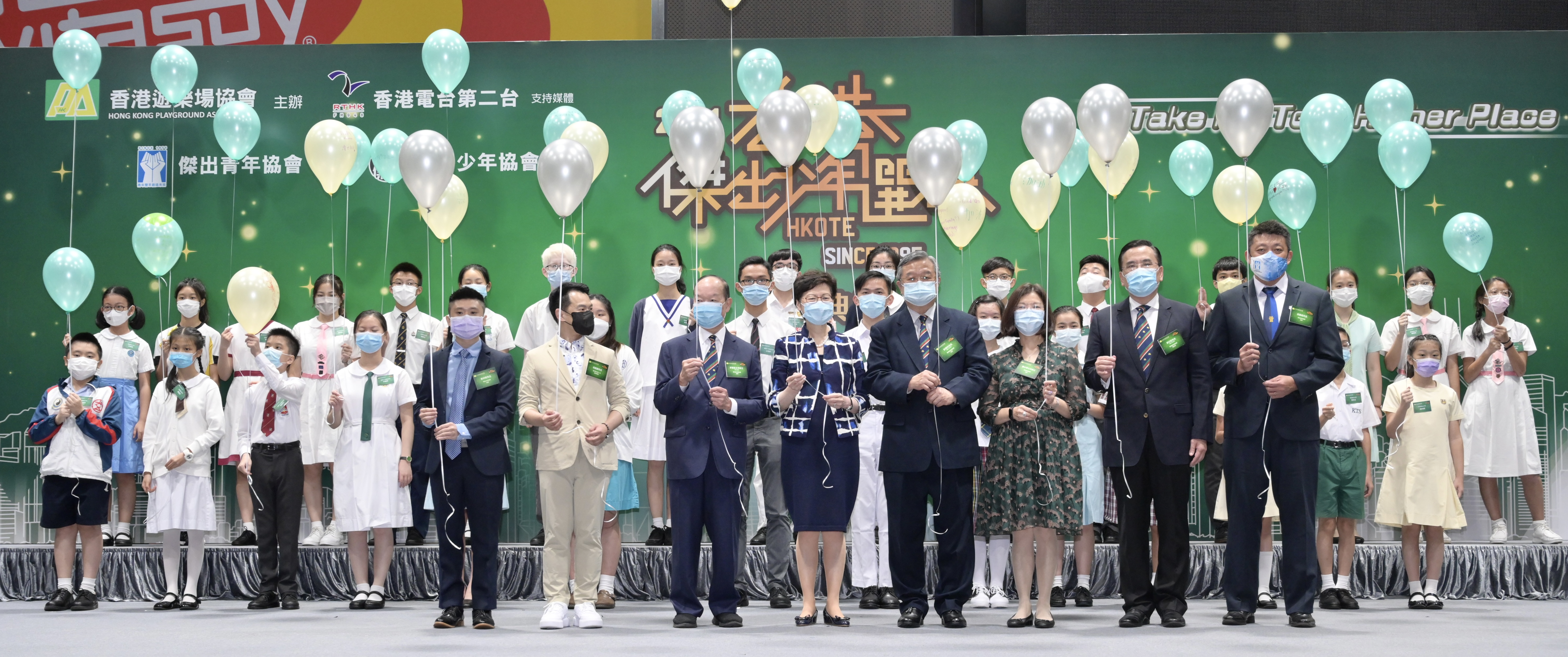林鄭(前排左四)今日與民政事務總署署長謝小華(前排右三)、香港遊樂場協會(協會)會長許晉奎(前排左三)、協會執行委員會主席彭詢元(前排右四)和其他嘉賓在協會主辦的「2021香港傑出少年選舉」頒獎典禮主持主禮儀式,後為「十大傑出少年」及「傑出少年」 得獎者。