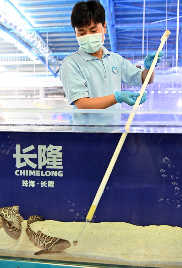2021年以來,珠海長隆海洋王國接連成功繁育3尾豹紋鯊。截至目前,3尾幼豹紋鯊體長在100厘米到150厘米,體重在300至400克,身體各項指標正常。