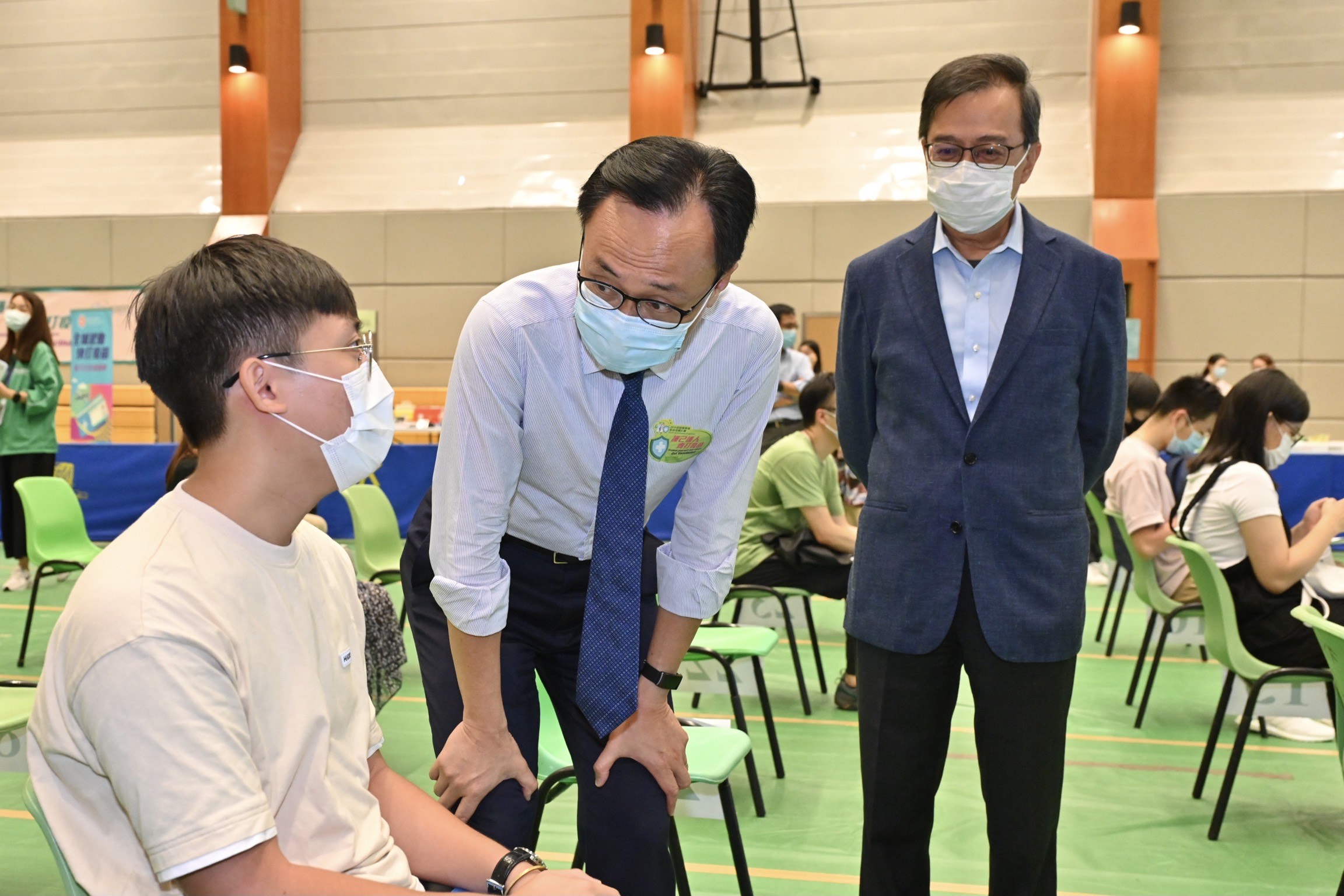 聶德權(中)與準備接種新冠疫苗的學生交談。旁為中大署理校長兼常務副校長陳金樑教授(右)。