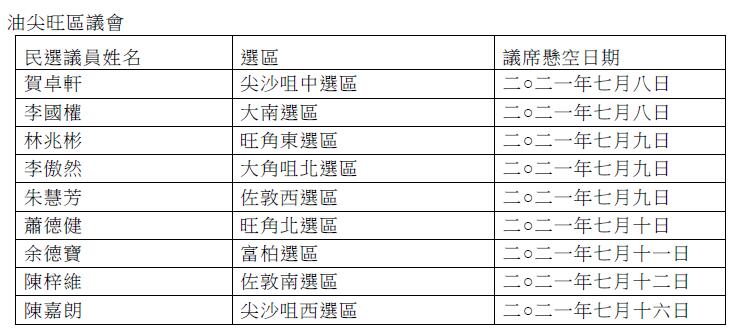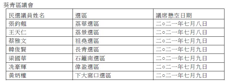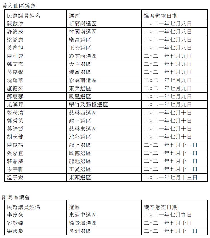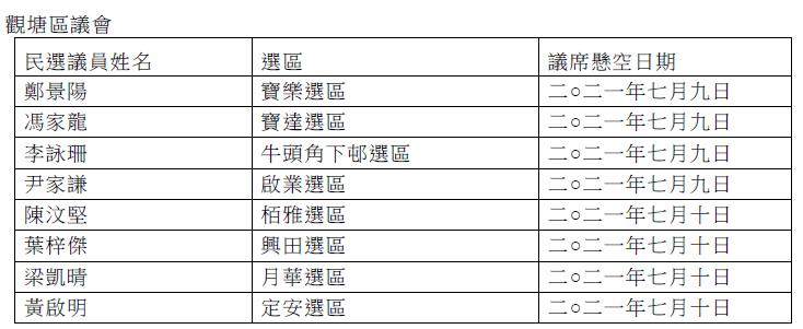 其中,議席懸空最多的分區為黃大仙區議會,有20席懸空,目前只餘下3名議員;其次為觀塘區議會,有19席懸空;中西區目前亦只餘下3名議員,未有足夠法定人數補選區議會正副主席。