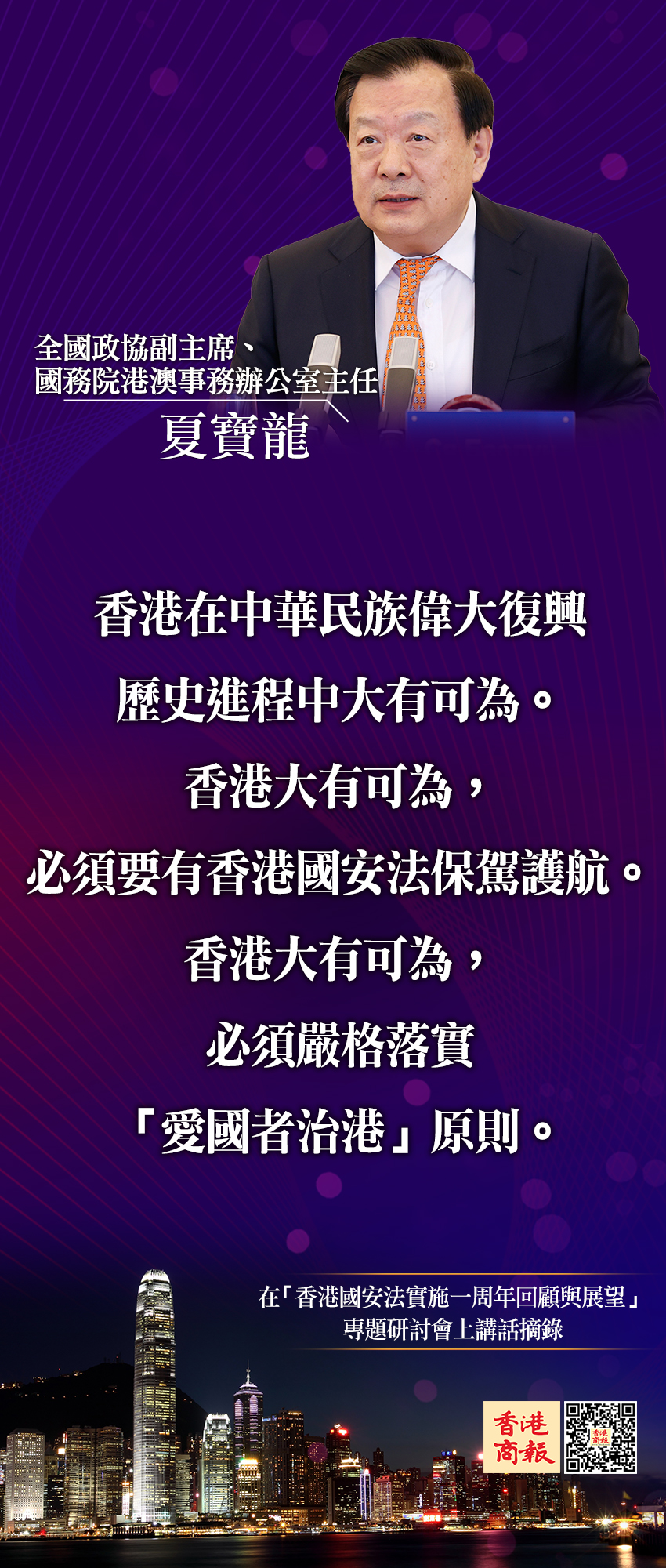 「香港國安法實施一周年回顧與展望」專題研討會今日(16日)舉行。全國政協副主席、國務院港澳辦主任夏寶龍出席開幕式並講話。夏寶龍表示,有香港國安法保駕護航,香港在實現中華民族偉大復興進程中必將綻放出更加璀璨的光彩。中華民族偉大復興,香港、澳門絕不能缺席。