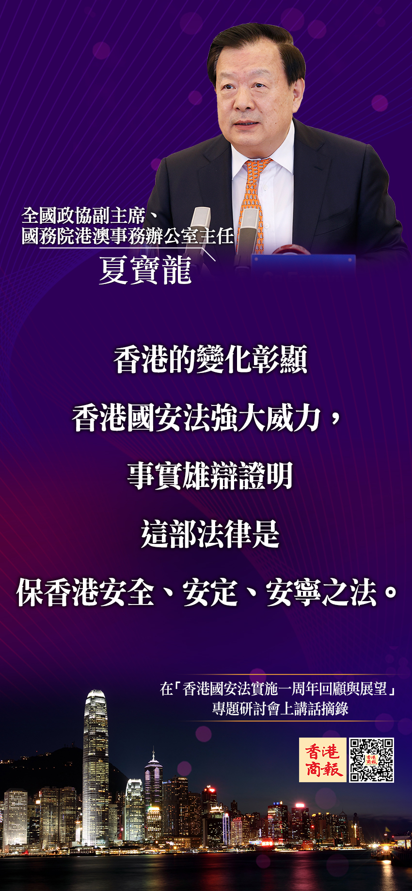 「香港國安法實施一周年回顧與展望」專題研討會今日(16日)舉行。全國政協副主席、國務院港澳辦主任夏寶龍出席開幕式並講話。夏寶龍表示,香港的變化彰顯香港國安法強大威力,事實雄辯證明這部法律是保香港安全、安定、安寧之法。