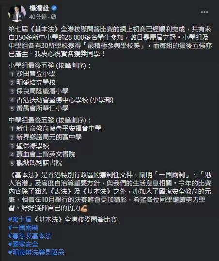 教育局局長楊潤雄在社交平台上祝賀第7屆《基本法》全港校際問答比賽得獎者,並提到《基本法》是香港特別行政區的憲制性文件,它闡明「一國兩制」、「港人治港」和高度自治的方針,與港人生活息息相關。