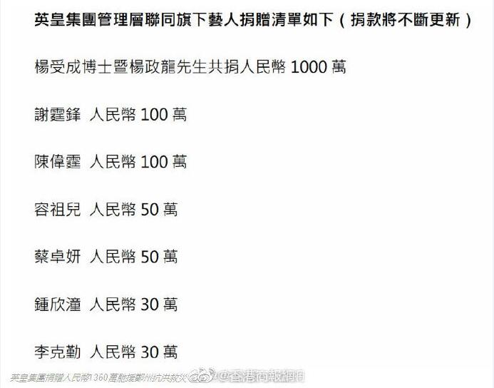 英皇集團主席楊受成博士及執行董事楊政龍先生率旗下眾星捐贈人民幣1360萬馳援鄭州抗洪救災英皇集團宣布率先通過「英皇慈善基金」捐贈合共人民幣1360萬元支援河南防汛搶險救災工作。捐贈主要用於保障當地群眾人身安全、採購救災物資全力助力政府與社會各界抗洪救災務求盡快幫助受災同胞,希望他們平安渡過難關。