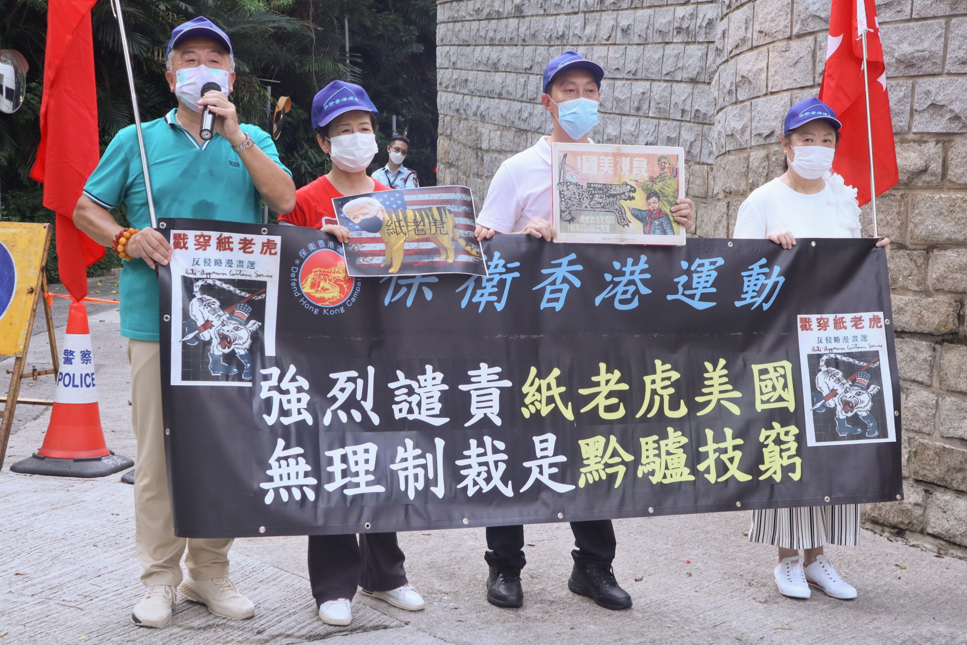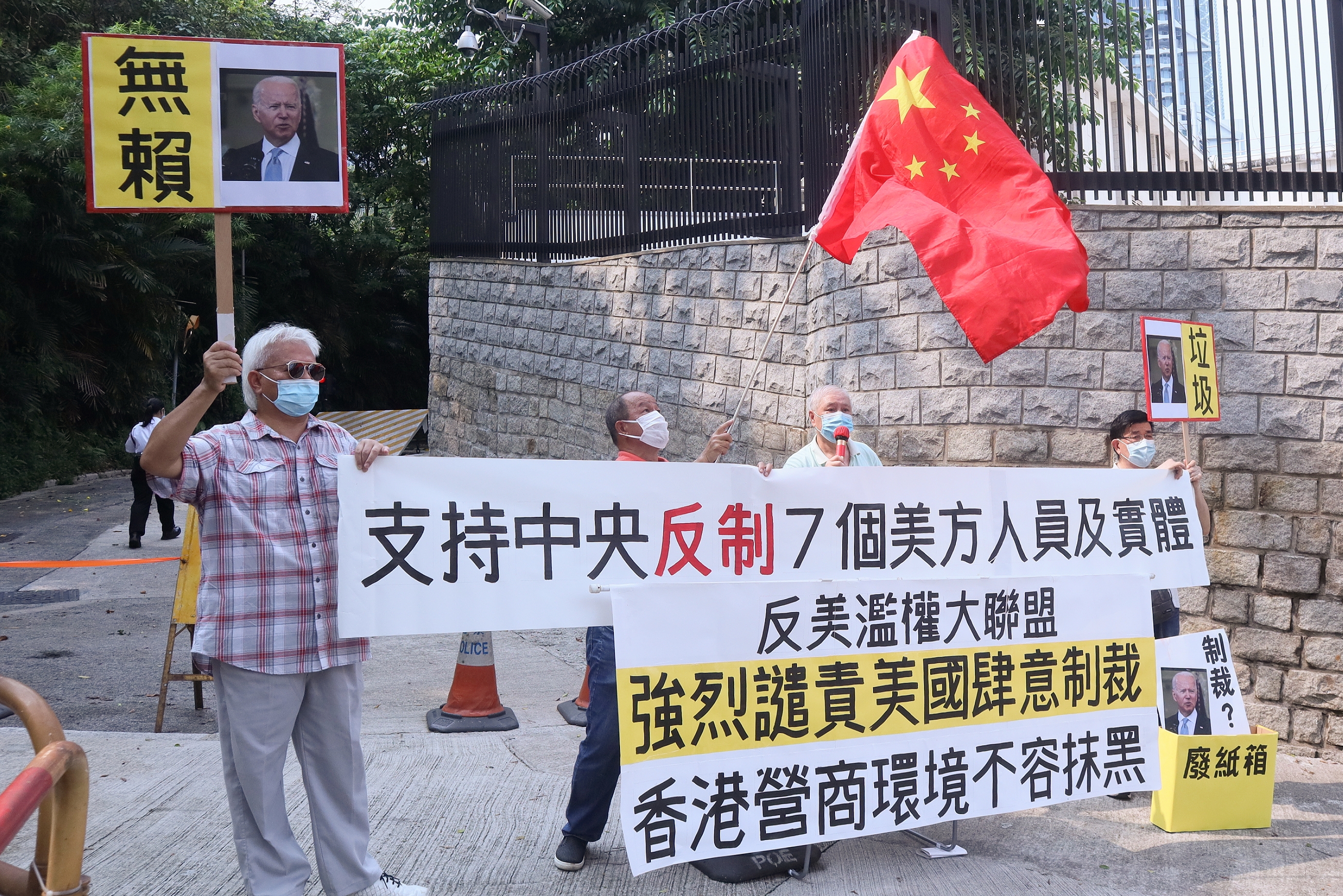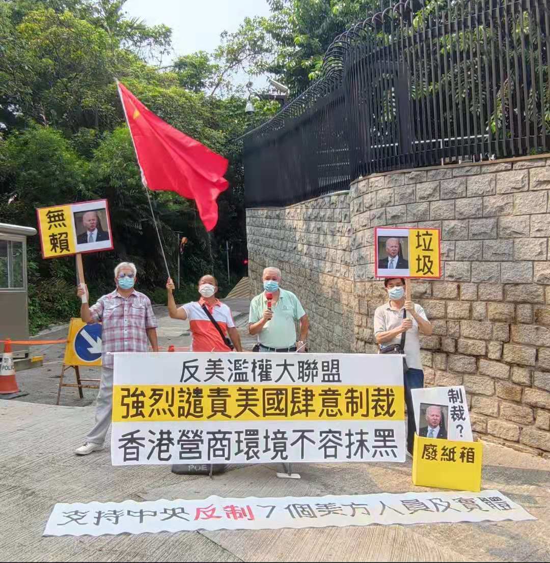 團體「保衛香港運動」、「反美濫權大聯盟」及市民今日(24日)先後到美國駐港澳總領事館外抗議,遣責美國無端抹黑香港營商環境,粗暴干涉中國內政,指所謂「制裁」是廢紙一張,並支持中國政府反制7個美方人員及實體。(記者馮瀚文攝)