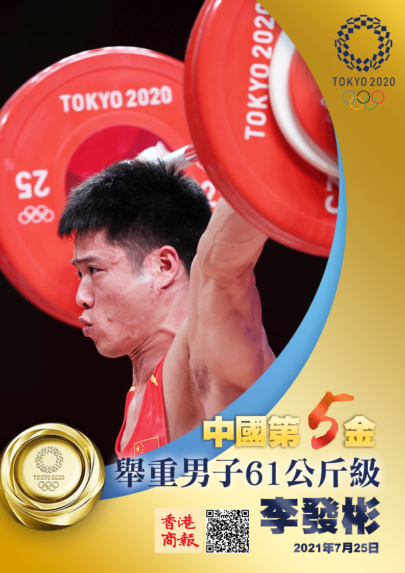 7月25日,東京奧運會舉重男子61公斤級,中國選手李發彬以抓舉141公斤,挺舉172公斤,總成績313公斤,獲得金牌。這是中國代表團在東京奧運會上獲得的第五枚金牌。李發彬創造了挺舉和總成績兩項奧運會紀錄。