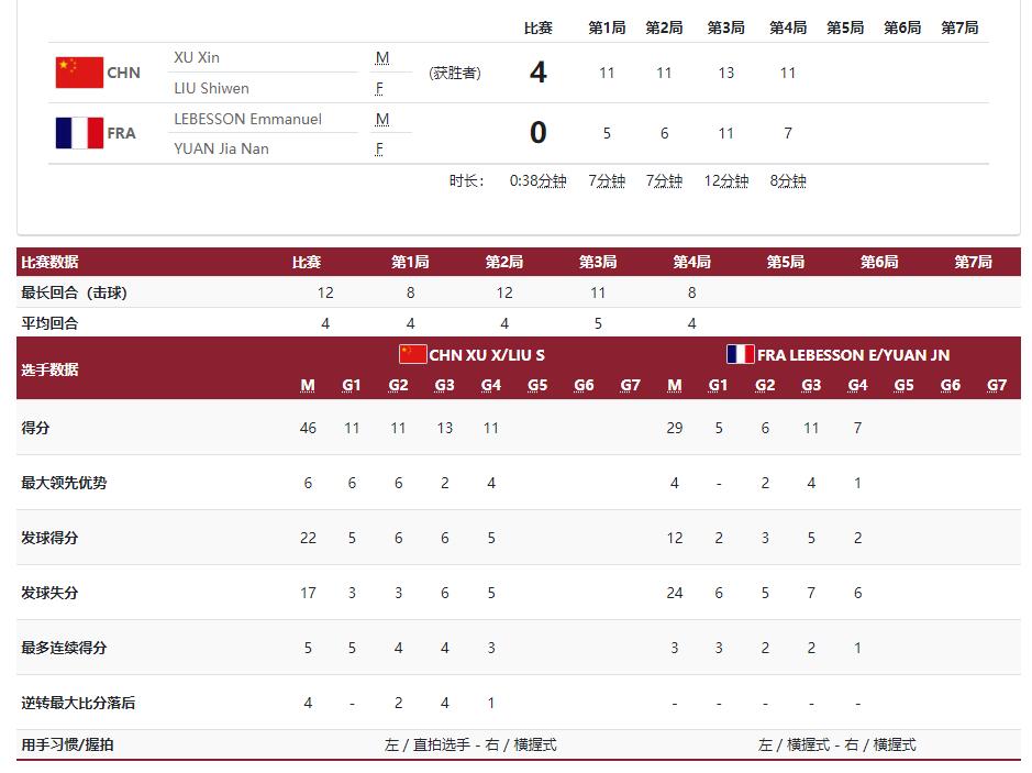 25日,東京奧運會乒乓球混雙4強賽事晚上開打,中國組合許昕/劉詩雯面對法國拍檔列比臣/袁嘉楠,結果中國隊直落以4比0橫掃法國隊,率先打入決賽。