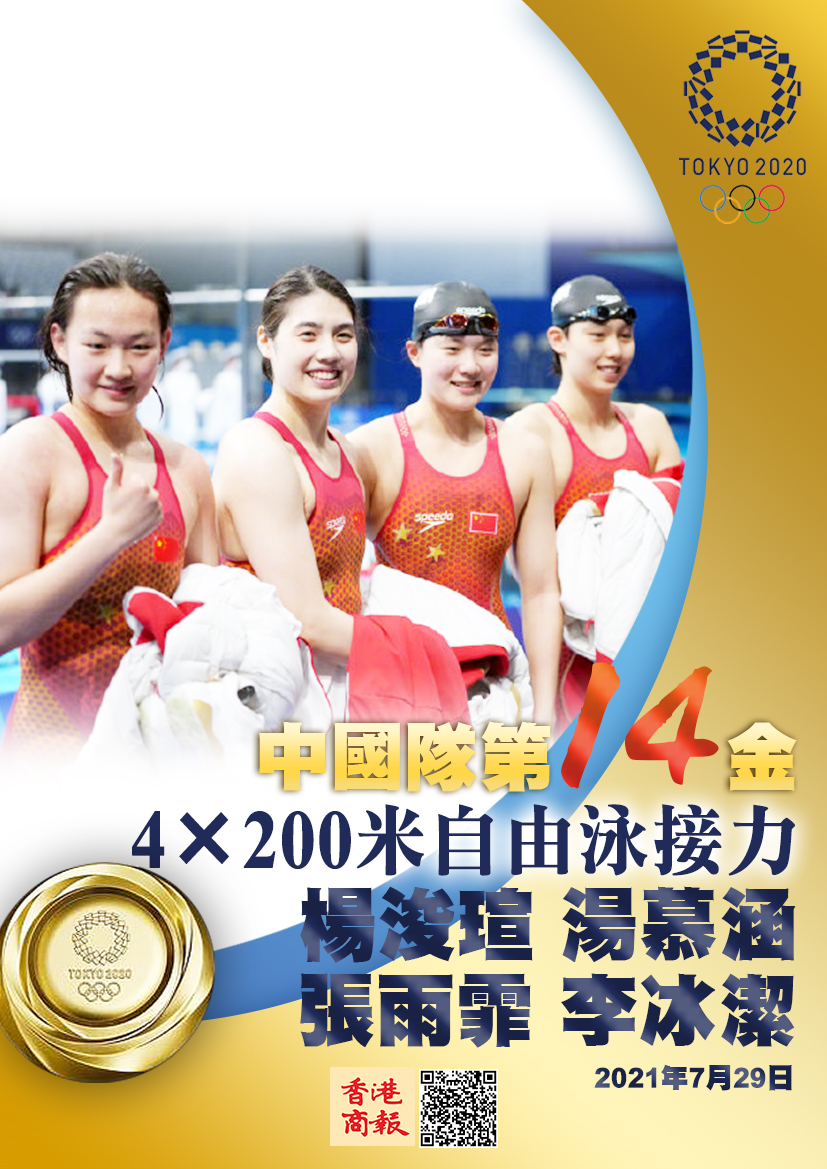 東京奧運會女子4x200米自由泳接力決賽中,中國組合楊浚瑄、湯慕涵、張雨霏、李冰潔組成的女子4x200米自由泳接力隊創造歷史,以7分40秒33的成績奪冠並刷新世界紀錄。