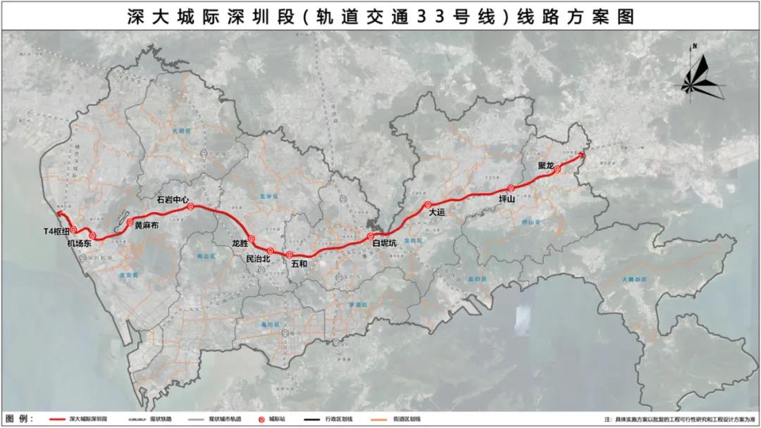 公示的线路方案显示,深大城际深圳段(轨道交通33号线)主要途经机场、石岩、龙华、坂田、白坭坑、大运、坪山、聚龙等地区,线路全长68.8公里,全线采用地下敷设方式,共设T4枢纽、机场东、黄麻布、石岩中心、龙胜、民治北、五和、白坭坑、大运、坪山、聚龙共11座车站,设置九围动车所一处以满足线路运营需求。