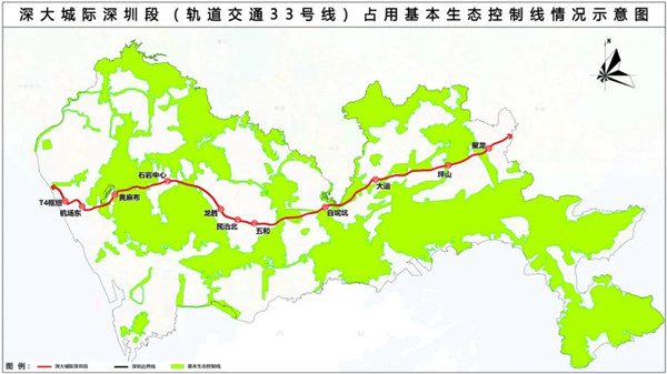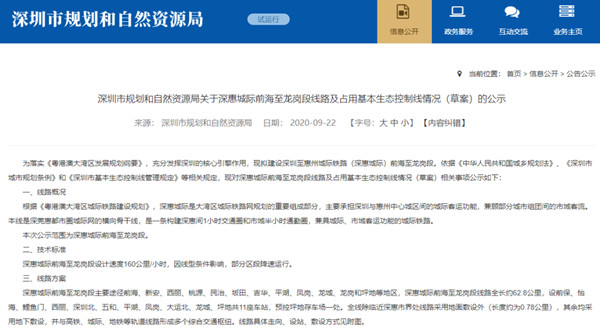9月22日,深圳市规划和自然资源局公示深大城际深圳段(轨道交通33号线)、深惠城际前海至龙岗段线路及占用基本生态控制线情况(草案)。