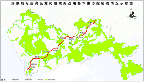 其中,线路涉及多处基本生态控制线,占用基本生态控制线面积约78公顷,包括塘朗山、甘坑-苗坑水库、低碳城郊野公园等,全线除低碳城郊野公园部分为区间地面穿越,其他涉及区域均为区间隧道穿越。