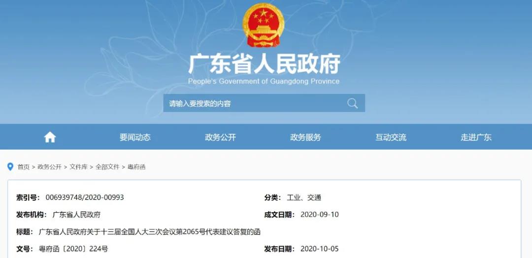 日前,《廣東省人民政府關于十三屆全國人大三次會議第2065號代表建議答復的函》(以下簡稱《答復函》)在廣東省人民政府網站发布。