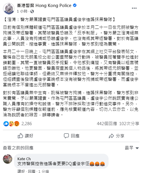 警方今晚(24日)在社交網站表示,日前有個別媒體報道屯門區區議員盧俊宇於本月21日在元朗被警方拘捕及帶返警署,其間被警員恐嚇及「反手制服」。警方嚴正澄清絕無此事,警員沒有拘捕或恐嚇盧俊宇,也沒有將其帶返警署。對於有區議員公開說謊,揑造事實,造謠抹黑警隊,警方感到極為震驚。