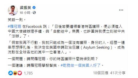 全國政協副主席梁振英則在Facebook发文揶揄,指羅冠聰的帖文屬「笑話一則」:「一個問題:請問羅冠聰,你的特區護照什麼時候到期?一個建議:請羅冠聰學(壹傳媒創辦人)黎智英,乾脆做一個英國人好了。」