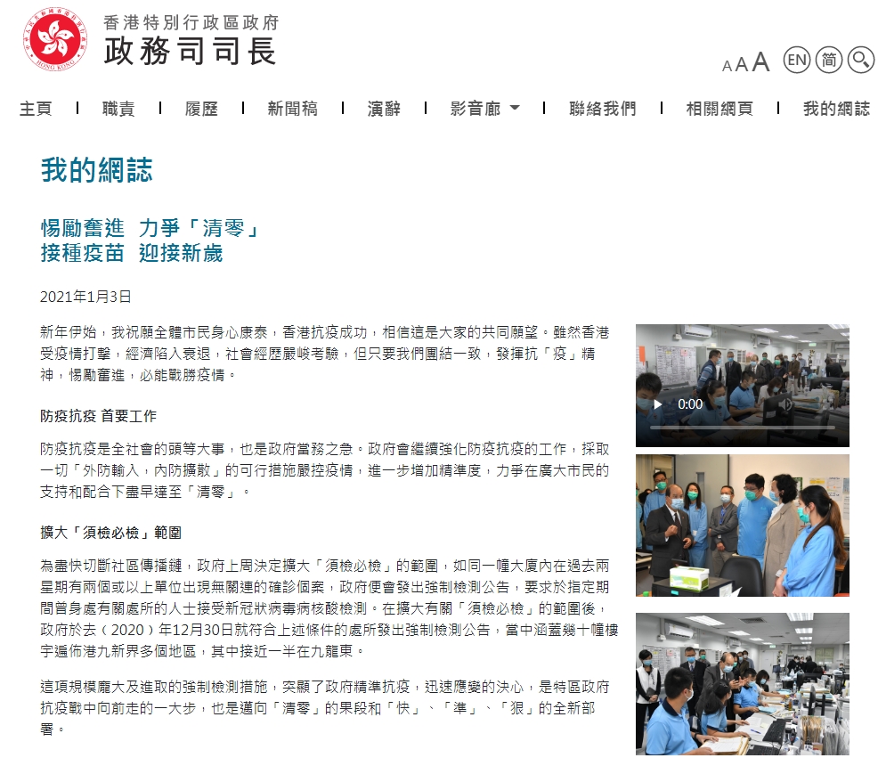 政務司司長張建宗發表網誌表示,防疫抗疫是全社會的頭等大事,也是政府當務之急。政府會繼續強化防疫抗疫的工作,採取一切「外防輸入,內防擴散」的可行措施嚴控疫情,力爭盡早達至「清零」。