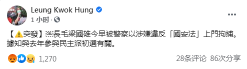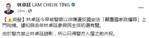 民主黨在社交網站Facebook發文称,前立法會議員涂謹申、尹兆堅、林卓廷、胡志偉、鄺俊宇及黃碧雲等,今早被警方國安處上門拘捕,指他們與去年參與民主派35+初選有關,涉嫌顛覆國家政權罪。民主黨仍在了解其他黨友情況。