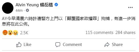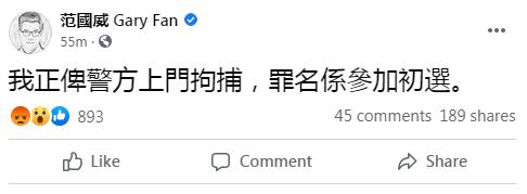 而范國威及楊岳橋亦在Facebook称今早被警方拘捕。今早7時許,范國威被探員鎖上手銬,登上警方車輛進入將軍澳警署。