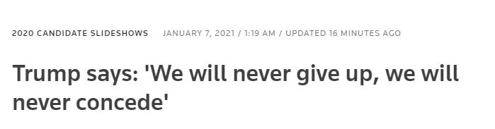 據CNN報道,美國國會周三下午舉行特別聯席會議,認證總統選舉人團投票結果之際,總統特朗普的支持者到國會大樓外示威。美國總統特朗普在華盛頓白宮外的集會現場對大批支持者發表演講,稱「我們永不退讓」。他的次子埃里克亦發言,指民主黨講大話、欺詐及竊取選舉,父親已展開行動,有關行動永遠不會結束。 華盛頓政府及警方派出3700多名警員執勤,又動員300多名國民警衛,應對可能出現的暴力場面,呼籲示威者不要帶槍進入華盛頓。這一演講原定於美國時間6日11時開始,到特朗普遲到近一小時才登台。