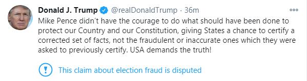 對此,特朗普發文斥責彭斯「沒有勇氣」。