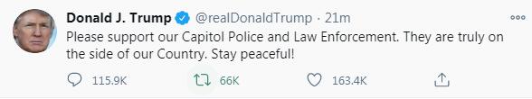 特朗普在Twitter發文,呼籲支持者和平示威,又稱大家支持國會警方和執法部門,形容他們與國家同一陣線。