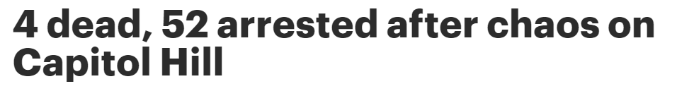 [12:21]据華盛頓警方表示,美國國會大廈星期三有4人死亡,其中3人死於緊急醫療事故,1人死於槍傷。此外,已有52人因涉嫌包圍美國國會大廈而被捕。