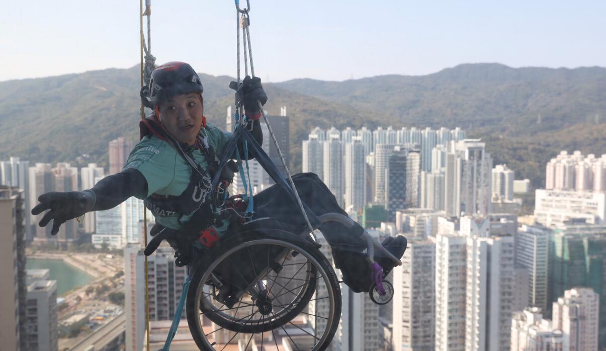 最新消息,黎志偉經過超過9小時,晚上攀爬到250米高位置,因受強風影響,身體連同輪椅被吹至大幅度搖擺,繩索打結,未能繼續攀爬,他由工作人員協助下,返回高約228米的第二層防火層位置,未能完成挑戰登頂。