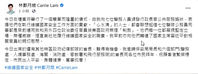 行政長官林鄭月娥今晚(10日)在社交媒體發文稱,今日在禮賓府舉行了一個簡單而隆重的儀式,由她向七位警務人員頒發行政長官公共服務獎狀,表揚他們在執行維護國家安全工作方面的貢獻。