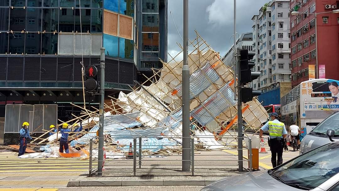 今日(7日)早上10時許,深水埗長沙灣政府合署外牆一幅約15米乘20米棚架搖搖欲墜,有途人發現報警,未幾棚架墮下路面,橫亙長沙灣道和欽州街交界,幸無人被擊中。消防員到場將棚架切斷,有待工人清理,現場部分路面需封閉。