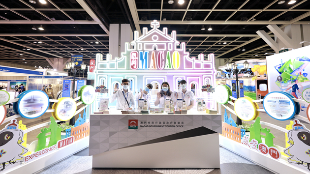 今年澳門展台以「澳門歡迎你 Welcome to Macao」作為主題,以觀眾熟悉的巨型大三巴配以夢幻的LED霓虹燈,勾起觀眾遊澳的美好回憶。接待處則參照全新澳門大賽車博物館的外型設計,兩旁並設有展示澳門新八景的波浪型展板,就像大三巴張開雙臂,再次迎接旅客到訪澳門。而可愛的澳門旅遊吉祥物「麥麥」則以澳門美食迎接大家,宣傳澳門創意城市美食之都。展臺內亦設有多媒體展板,展示澳門最新的入境資訊、旅遊產品及活動、節日盛事等。觀眾除了可以索取旅遊資料外,追蹤社交媒體或下載手機應用程式更有機會獲取紀念品一份。