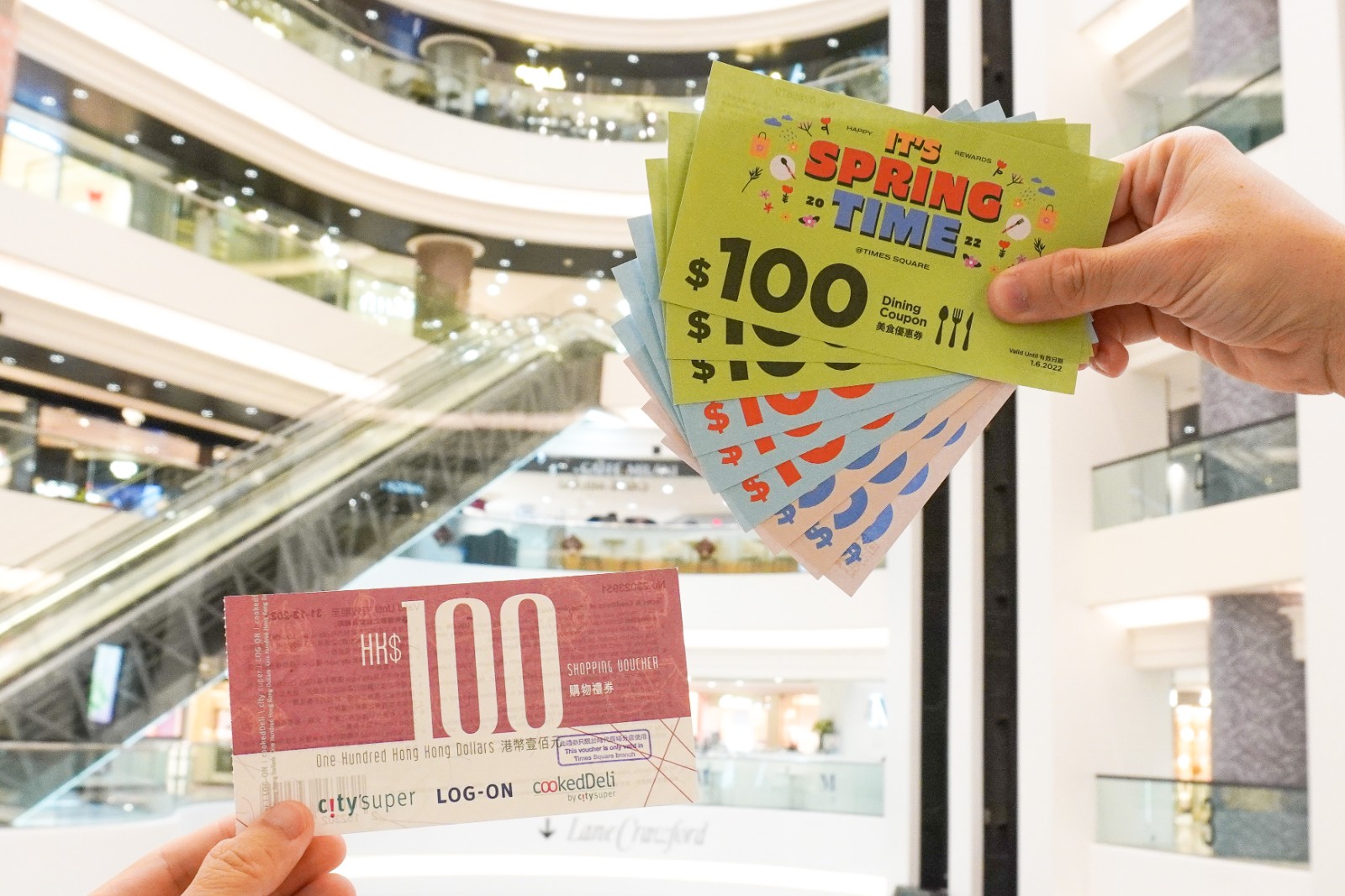商場的Happy Rewards會員由即日起至5月15日期間,在場內商戶即日以電子消費每滿指定金額,即可換領購物優惠券及美食優惠券,如即日消費總額每滿HK$1,500(最多可累積三張於不同商戶之單據),可換領HK$100購物優惠券一張及HK$100美食優惠券一張;每滿HK$4,000(最多可累積三張於不同商戶之單據),可換領HK$500購物優惠券一張。而逢星期四及星期日全日更可享雙倍優惠券獎賞。優惠券可於多達130間商戶內使用,享低至5折優惠。