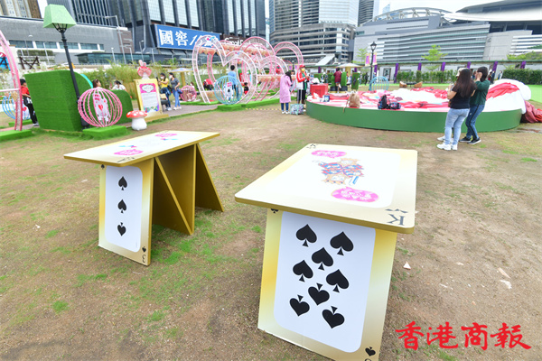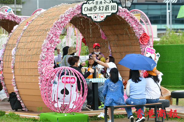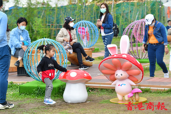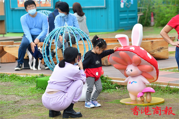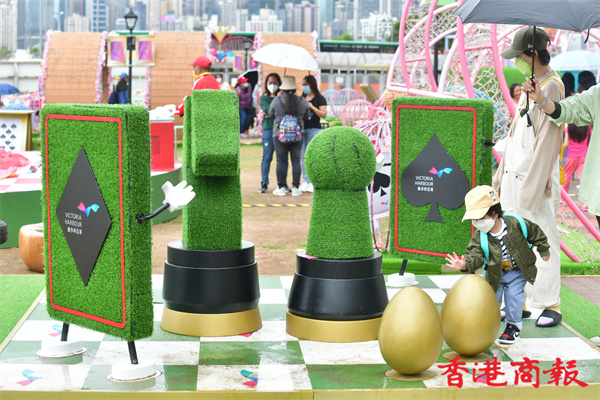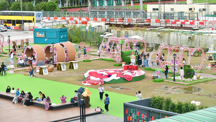 灣仔海濱長廊是布滿本地插畫家「Chocolate Rain」的可愛卡通作品,其中菇菇兔更是足跡處處,帶着市民穿梭在色彩繽紛巨型餐桌、如真人般高的大棋盤、粉紅心心通道、沙發之間,更設有一個旋轉木馬外型的玩樂設施。今天天氣轉冷、細雨紛紛,無損大人小孩的童心,人人樂而忘返。而莊園內原本設有八米高的吹氣特色巨型蛋糕,但強風下,蛋糕變成一塊布攤在草地上避風。